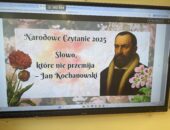 Na początku września nasza szkoła po raz kolejny wzięła udział w akcji NARODOWE CZYTANIE. Wszystkie klasy w tym dniu czytały utwory Jana Kochanowskiego, a młodsi wysłuchali również opowiadania na temat poety. Potem wykonali kolorową ilustrację.