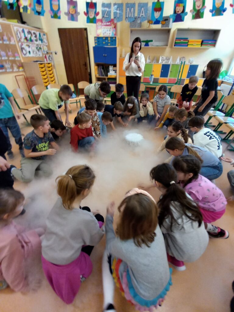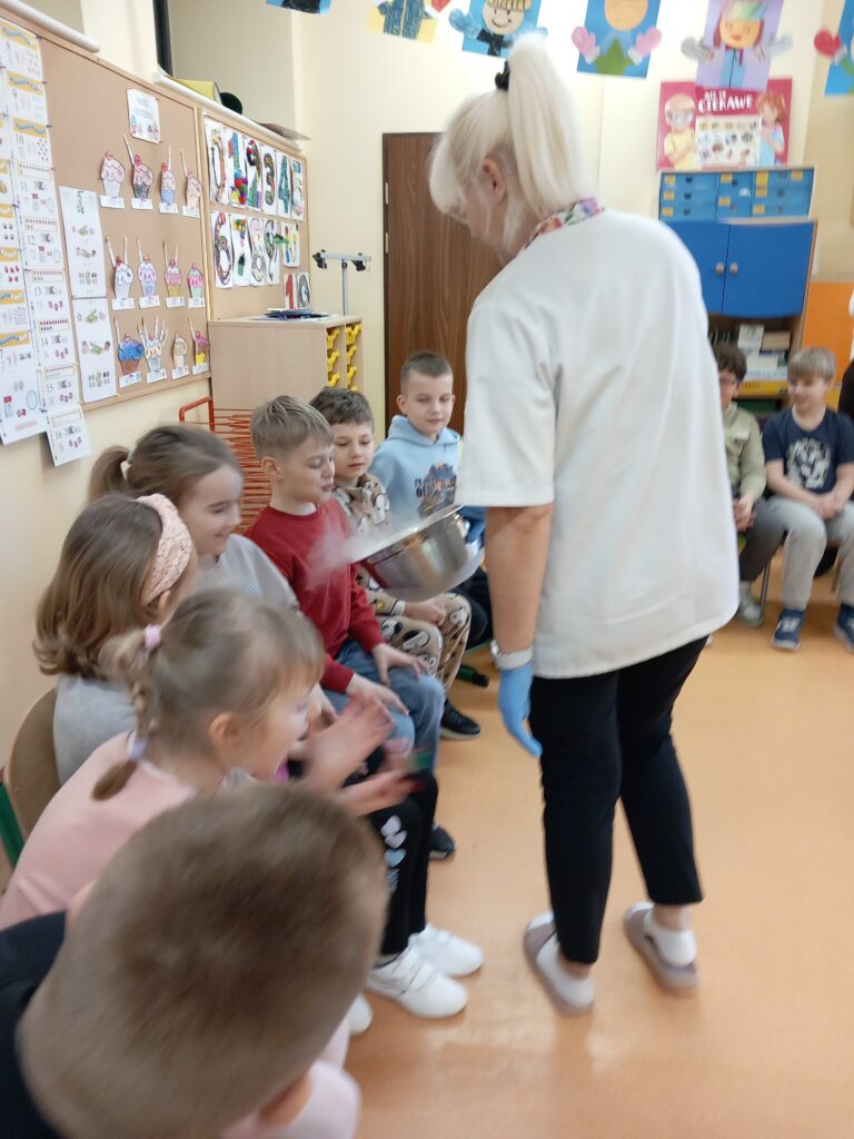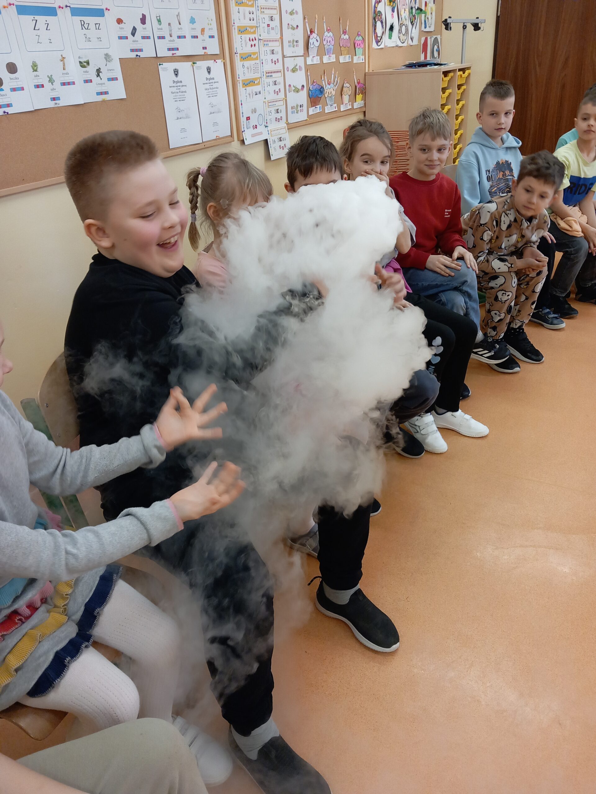 W dniu 7 marca 2025 r. w naszej szkole odbyły się warsztaty z kuchni molekularnej. Uczniowie z klas 1-3 wzięli udział w eksperymentach z wykorzystaniem mroźnych substancji takich jak: suchy lód i ciekły azot. Obserwowały tworzenie mgły i tańczących kropelek azotu oraz uczestniczyły w balonowych eksperymentach. Dzieci miały możliwość spróbowania dymiących smoczych chrupek podczas jedzenia których z ust i nosa wydobywał się dym. Spróbowały też dymiące soczki oraz sorbetowe lody wykonane przy użyciu ciekłego azotu. Uczniowie z wielkim zaangażowaniem uczestniczyli w warsztatach i bardzo im się podobały.